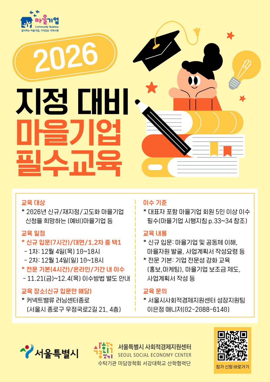 ​서울시사회적경제지원센터에서 주관하는 <마을기업 필수교육> 과정을 이수하셔야 합니다.