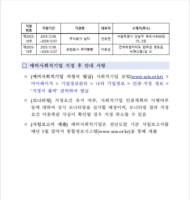 [고용노동부 공고] 2025년 제2차 고용노동형 예비사회적기업 지정 결과 공고