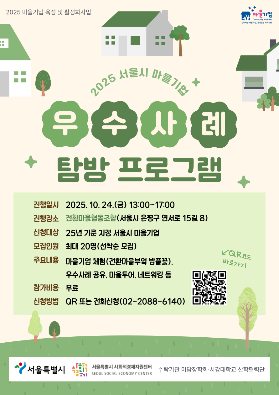 서울특별시 사회적경제지원센터(수탁기관 미담장학회, 서강대학교 산학협력단)에서는 서울시 마을기업 우수사례 공유와 마을기업 네트워크를 위해 <마을기업 우수사례 탐방 프로그램>을 운영하오니 많은 관심과 참여 부탁드립니다.