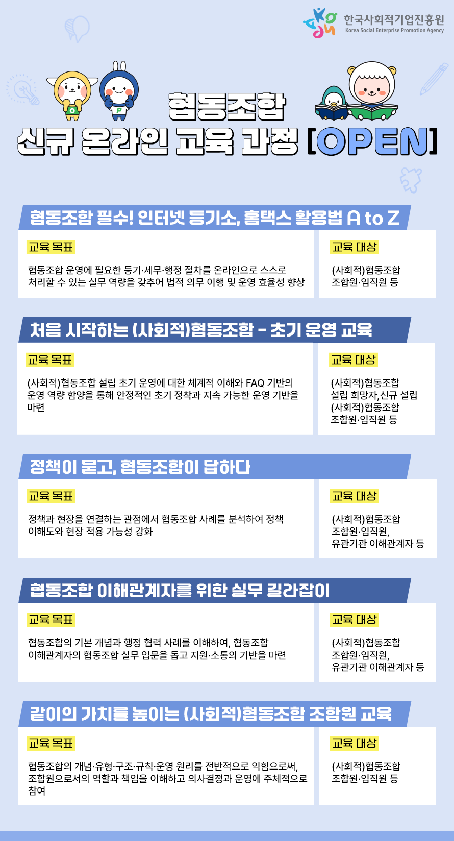 ★협동조합 신규 온라인 교육 과정 OPEN!(개념, 정책, 행정, 초기 운영, 등기, 세무 등)