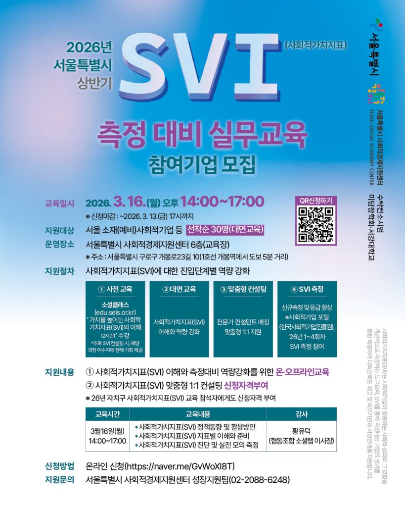 2026년 서울특별시 SVI(사회적가치지표) 측정 대비 실무교육 참여기업 모집(~3.13.)