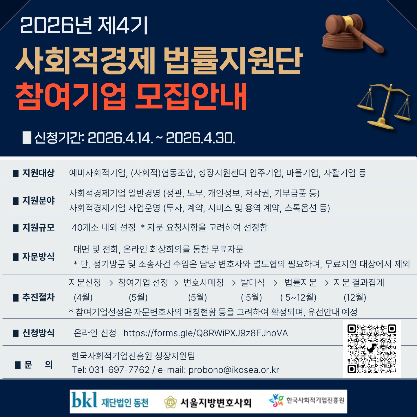 [모집] 2026년 제4기 사회적경제법률지원단 참여기업 모집(~4.30(목))